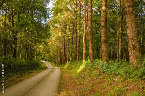 road, asphalt, grass, path, way, pine, conifer, tree, park, forest, highland, hill, mountain, national park, transportation, curve, background, summer, light, wood, sunlight, nature, landscape, green, natural, travel, season, day, environment, scene, beautiful, bright, plant, spring, nobody, view