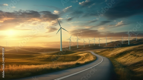 Long road on wind turbines produce electricity filed, Renewable green energy, save world concept, Generative AI