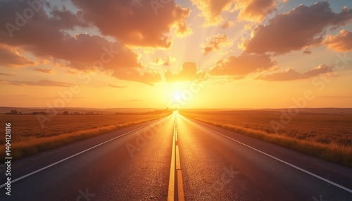 Long straight asphalt road leads to sunset horizon. Bright sun illuminates sky, clouds above empty highway. Concept travel, journey, freedom, trip, vacation, forward way, success.