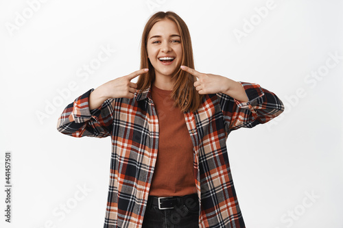 Look at my new teeth. Smiling happy woman did whitening at dental clinic, pointing at mouth with pleased smile, recommend stomatologist, standing against white background