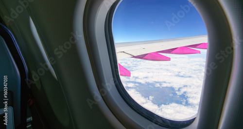 Looking through aircraft window at wing, clouds and blue sky, Iceland, Europe.