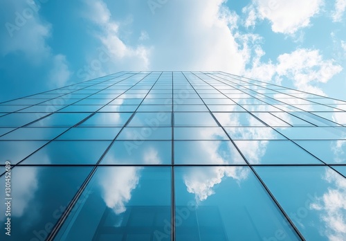 Looking Up at a Modern Glass Building Reflecting Clouds in a Bright Blue Sky with Beautiful Natural Light and Clear Reflection on a Sunny Day