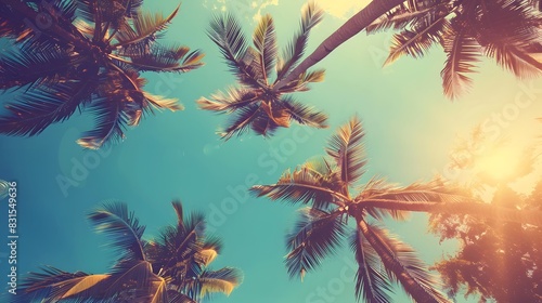 Looking up at blue sky and palm trees, view from below, vintage style, tropical beach and summer background, travel concept.