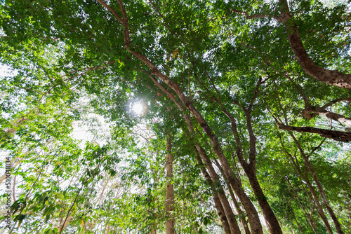 looking up at the sky in the forest with the sunlight.