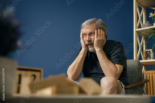 Loosing control. Old bearded man with alzheimer desease sitting on the chair and suffering from headache. Concept of illness, memory loss due to dementia, healthcare, depression, stress out.