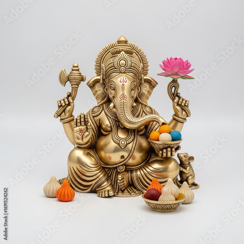 Lord Ganesha idol with lotus and modaks on a plain white background
