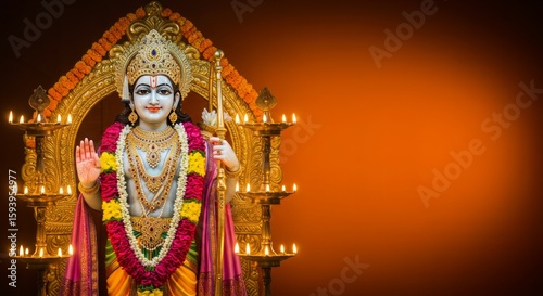 Lord Rama’s idol decorated with floral garlands and lamps, glowing orange-to-gold gradient backdrop