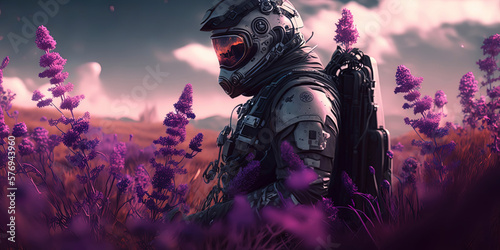 astronaut, purple flower, field, nature, exploration, science fiction, futuristic, adventure, discovery, outer space, extraterrestrial, botany, flora, alien, landscape, beauty, serenity, calmness, relaxation, escape, dreamscape, imagination, fantasy