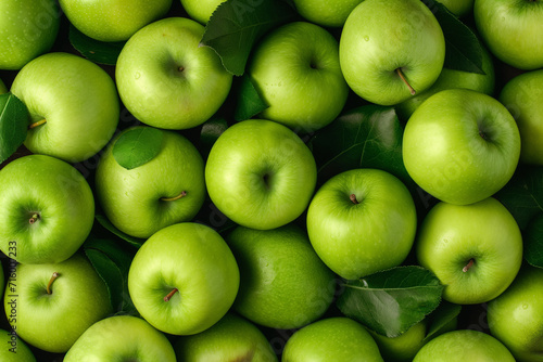 lots of green apples with leaves lying on top of each other, for background, top view