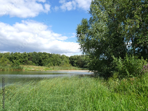 Lots of green grass and a river. Blue sky and clouds. Summer sunny day
