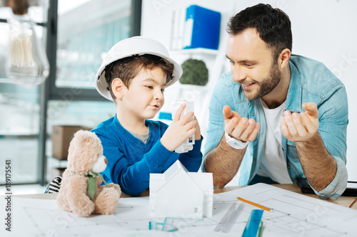 Lots of questions. Cute little boy in a white hard hat sitting at the table next to his father, holding a 3D house model and asking his father many questions about it