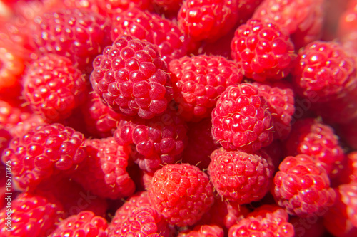 Lots of ripe raspberries. Bright crimson berries. Harvest.