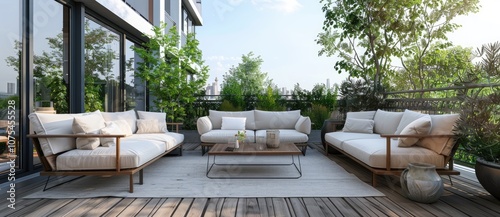 lounge chairs and tables.modern outdoor living room with trees concept.