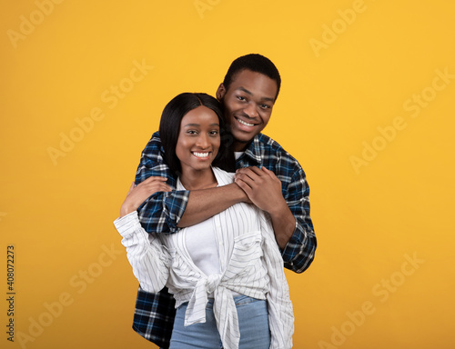 love, date, human relationships, family, happy, together, smiling, african american, man, hugging, wife, casual attire, look, camera, isolated, yellow, background, studio shot, free space, cut-out, romantic, young, natural, human, emotion, couple, portrait, woman, flirt, friends, 2, quarantine, free time, husband, modern, health care, married, lifestyle, romance, student, fashion, fun, friendship, positive, people