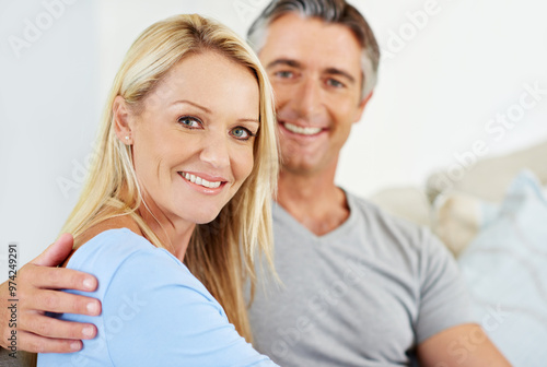 Love, hug and portrait with mature couple on sofa for romance, smile and marriage milestone. Happiness, calm and commitment with man and woman in living room of home for peace, bonding and trust