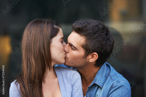 Love, kiss and a young couple outdoor for care, commitment and people in connection. Romance, man and woman touch lips together for bonding, trust in relationship and affection on valentines day date