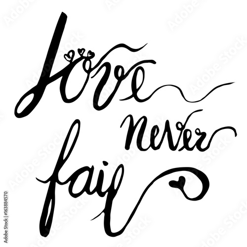 Love never fail calligraphy hand draw design black illustration on white background with some little hearts decoration.
