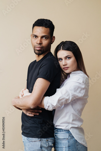 Love, new mixed race parents and family concept - very happy couple, celebrating the news of a pregnancy. Beige background.