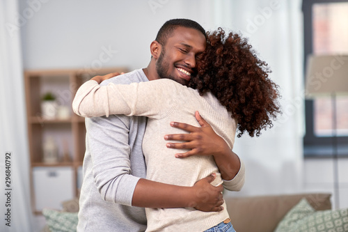 love, relationships and people concept - happy african american couple hugging at home