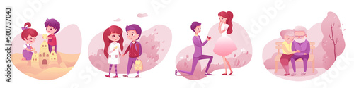 Love scenes of couples set, boy and girl building sand castle, walking, marriage proposal