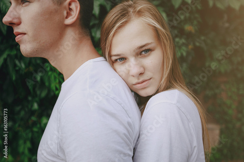 background, caucasian, male, female, love, man, couple, happy, romantic, young, beautiful, woman, girl, together, street, adult, 2, lifestyle, people, summer, beauty, day, hair, photogenic, person, portrait, style, lovely, shirt, white, clothes, building, green