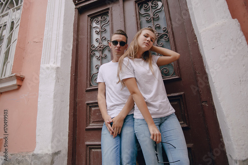 background, caucasian, male, female, love, man, couple, happy, romantic, young, beautiful, woman, girl, together, street, adult, 2, lifestyle, people, summer, beauty, day, hair, photogenic, person, portrait, style, lovely, shirt, wall, brown, white, clothes, pant, door, goggles