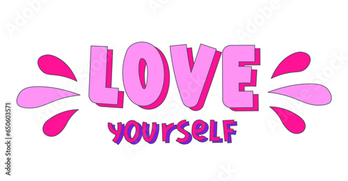 Love yourself funny lettering. Handwritten motivation text for print in trendy retro style. Pink inscription for t shirt, girl, woman
