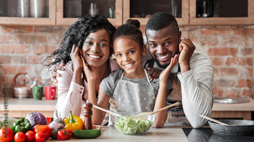 Lovely black family cooking healthy dinner together at kitchen, posing at camera, making salad, panorama with copy space