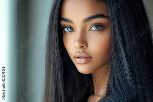 Lovely calm mixed-race girl - for ads, media and social online ad banner use. Commercial digital ads conceptual art art. Long trim - straight hair. Colored hair elegance. Elegant black woman.