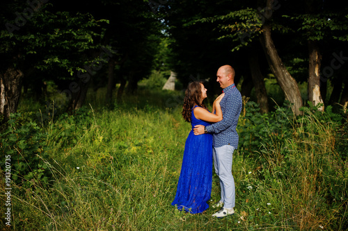 Lovely couple in love at green park. Girl in blue dress.