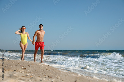 beautiful, outdoors, summer, travel, vacation, resort, beach, sea, ocean, body, adult, male, man, woman, female, young, girl, people, couple, caucasian, love, happy, smiling, swimwear, hand, holding, fun, sand, space, running, attractive, nature, honed, exotic, tropical, holiday, fashion, time, spending, lovely, together, walking, red, relax, boyfriend, girlfriend, landscape, teenage, shore