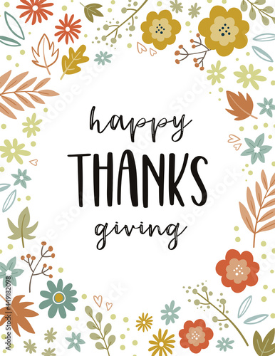 Lovely hand drawn Thanksgiving design with flowers and autumn leaves, cute doodle background, great for invitations, covers, banners, cards -vector design