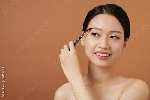eyebrow, brush, make-up, style, fashion, beauty, get ready, studio shot, portrait, beauty treatment, woman, skincare, beauty product, young, bodycare, complexion, femininity, care, asian, applying, vietnamese, glamour, female, make-up, skincare, skin, well-being, studio, orange, clean, naked