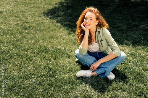 Lovely woman sitting on grass outdoors in a park on a sunny day, enjoying leisure and a happy relaxing moment