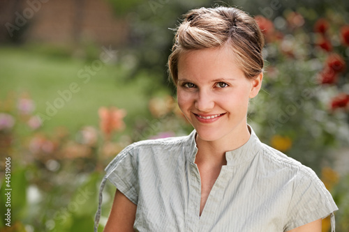 woman, girl, friendly, outside, happy, blond, eye, teeth, bokeh, pretty, pretty, flower, garden, smile, friendliness, look, charming, laid back, fun, fresh, natural, people, attractive, carefree, portrait, female, feminine, lovely, confident, positive, mood