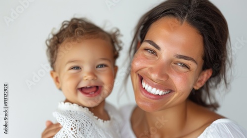 Loving bond between a mother and her joyful baby, highlighted in a light studio.
