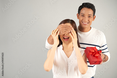 smiling, happy, asian, couple, young, woman, man, love, human relationships, romantic, date, dating, standing, celebrate, celebration, holiday, anniversary, valentine, day, valentine, girlfriend, boyfriend, covering, eye, hand, surprise, studio, shot, grey, background, photogenic, passing, present, gift, box, copy space