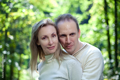 Loving couple on a background of green foliage.