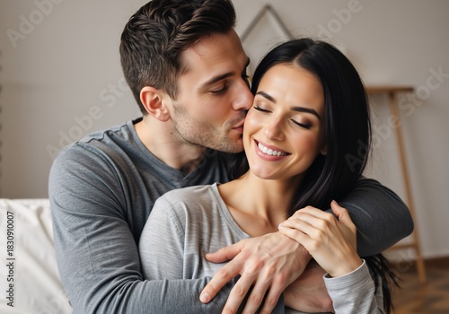 couple, love, romance, kissing, man, woman, happy, smiling, affection, intimacy, human relationships, hugging, hugs, cheek, young, caucasian, indoor, home, lifestyle, portrait, togetherness, dating, boyfriend, girlfriend, husband, wife, partner, tender, care, feeling, emotion, joy, cheerful, bonding, closeness, casual attire, grey, shirt, photogenic, attractive, 2, people, valentine, sweet, gentle, marriage