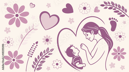 Loving Mother and Baby Illustration with Flowers and Hearts