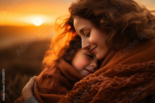 Loving Mother Embracing daughter in the Glow of the Sunset with Ample Space for Text. Mothers day