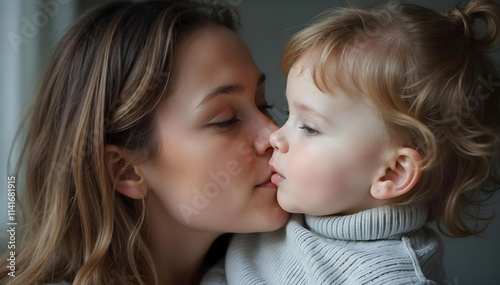 Loving mother tenderly kissing her baby while cuddling together on a cozy bed in a warm and peaceful