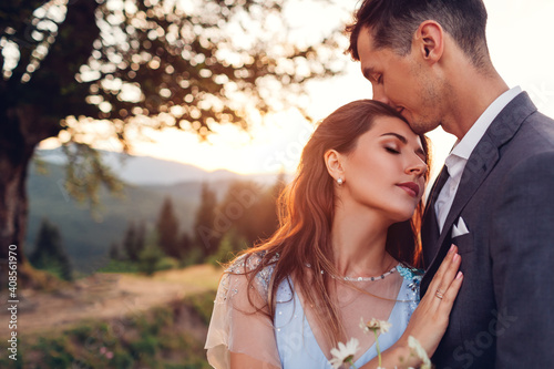 Loving wedding couple hugging in mountains at sunset. Portrait of bride and groom in summer Carpathians. Valentine's day