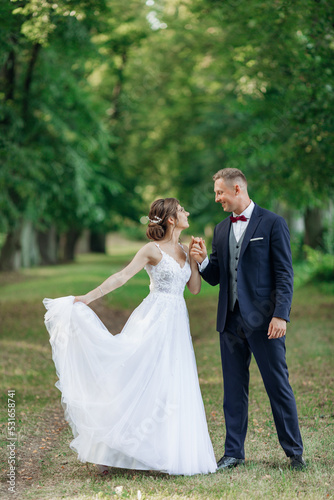 bride, groom, couple, holding, hand, dancing, looking, wedding, celebration, love, human relationships, engagement, family, affection, happy, husband, wife, woman, man, married, romance, honeymooners, passion, green, ceremony, dress, nature, together, beauty, park, summer, matrimony, sensual, young, grass, outside, partner, tenderness, fashion, nuptials, charming, suit, vertical, honed, amazing, white, loving, half face