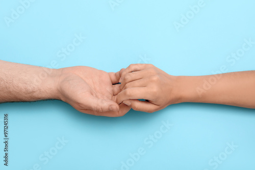 Loving young couple holding hands on blue background