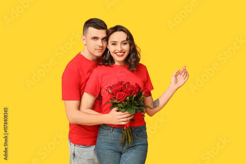 Loving young couple with bouquet of beautiful roses on yellow background. Celebration of Saint Valentine's Day