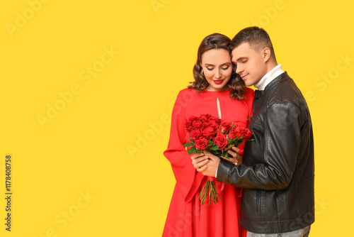 Loving young couple with bouquet of beautiful roses on yellow background. Celebration of Saint Valentine's Day