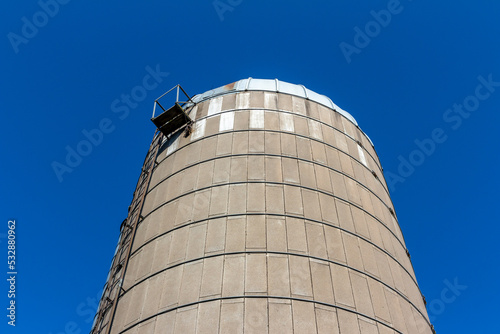 farm, building, wall, round, exterior, architecture, outdoors, agriculture, vintage, old, ladder, tall, tower, silage, fodder, eat, farm animal, old-fashioned, concrete, cement, storage, bin, spring, summer, autumn, no people, abstract, texture, background, blue, sky, rustic, copy space, structure, design, strength, sunlight, sunny, day