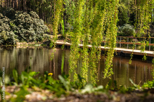 Low angle photo of bright green weeping birch tree (Betula pendula) branches hanging at front of water, bridge and forest garden during sunny spring day. Branches of birch tree at forest, bridge and p
