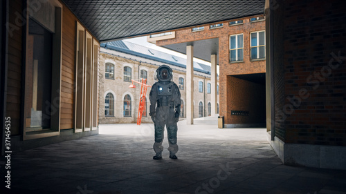 Low Angle Shot of a Confident Handsome Astronaut is Stands in a Neighbourhood with Modern Scandinavian Buildings. Man in Futuristic Suit with Technological Panel on His Hand.